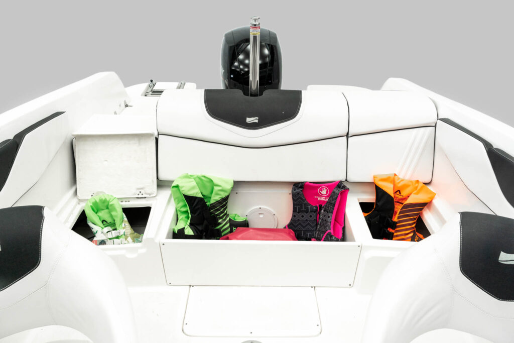 En su interior, todo está pensado para disfrutar: asientos envolventes, sofá trasero con espacio de guardado y tapicería premium resistente al sol. Su acceso a popa y escalera plegable hacen que entrar o salir del agua sea parte del placer.