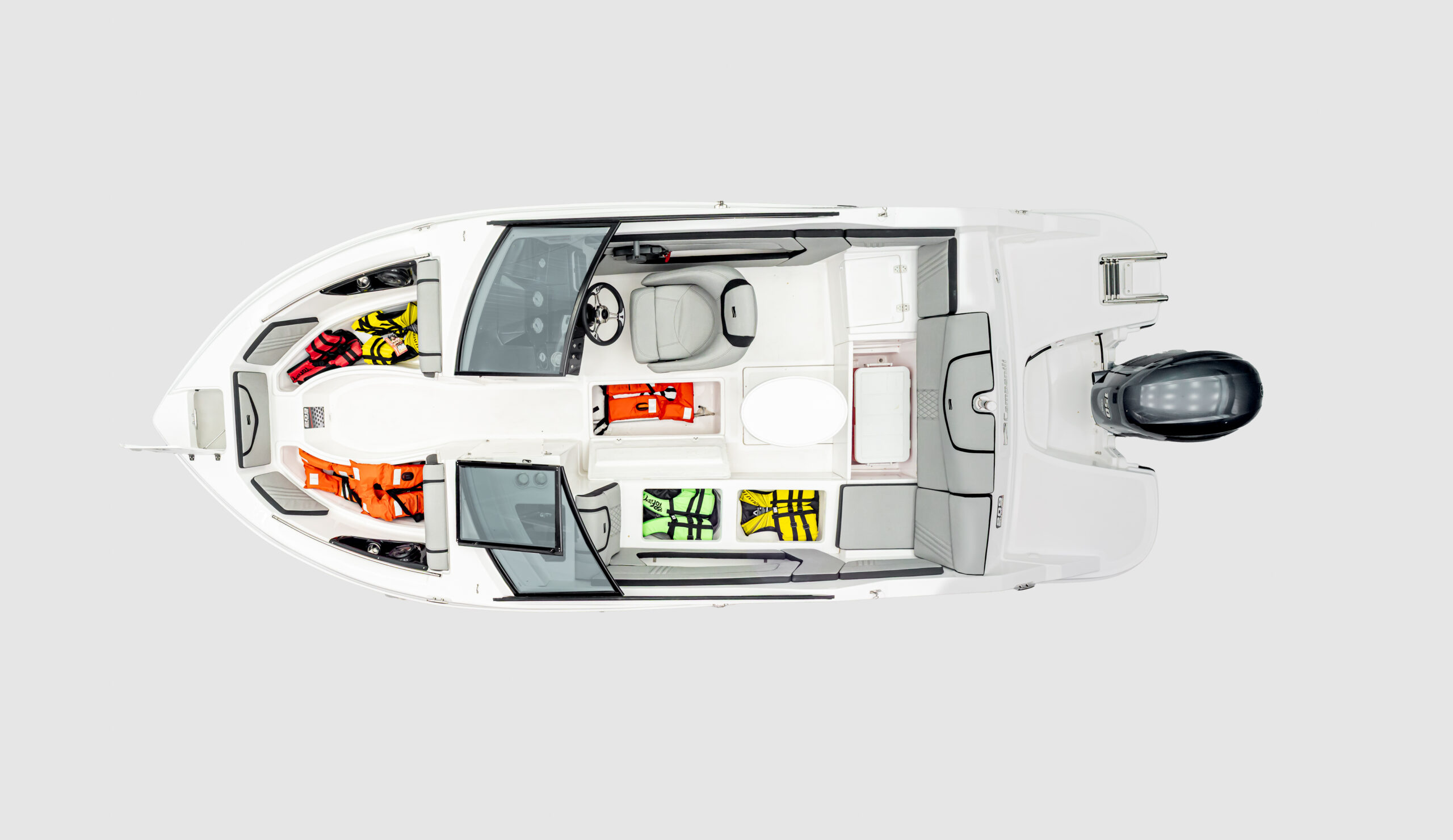• Asientos tapizados en proa con almacenamiento moldeado debajo.