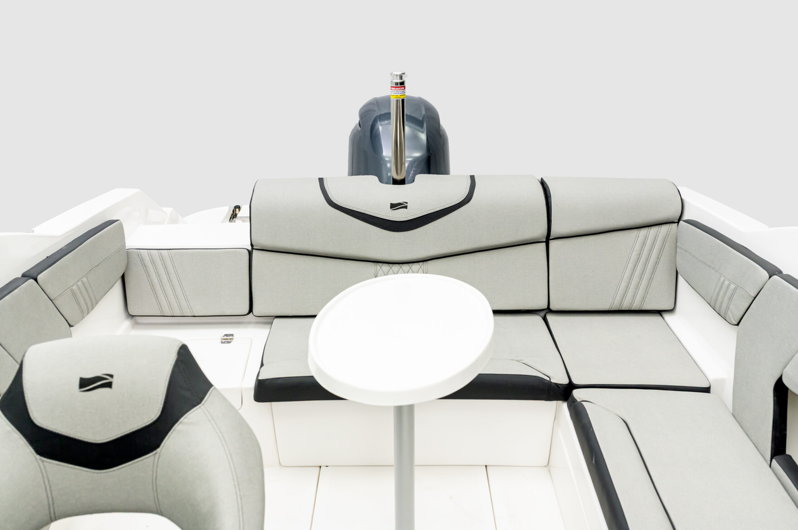 • Sofá de popa con compartimento para refrigerador incorporado y compartimentos de almacenamiento a babor y estribor
