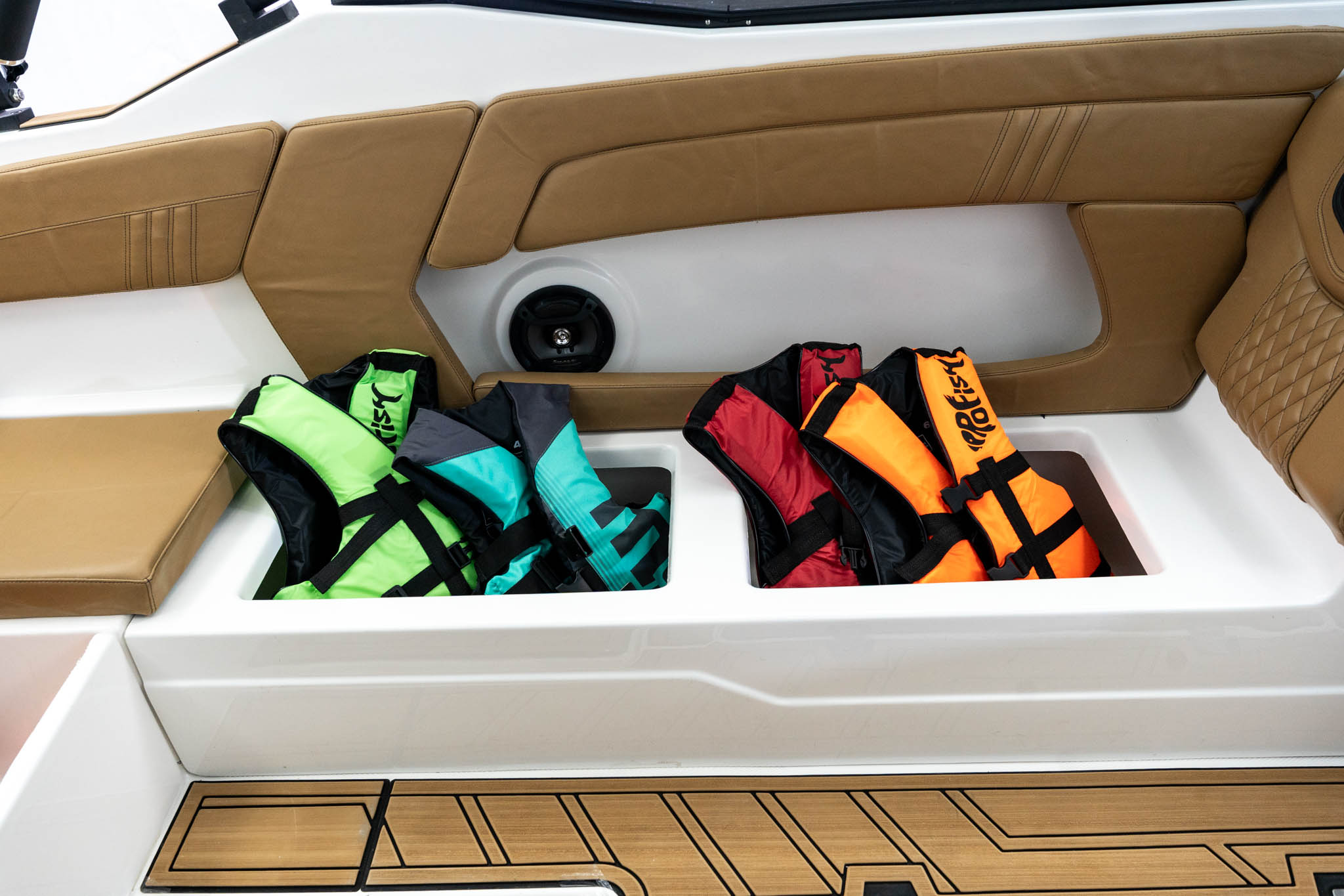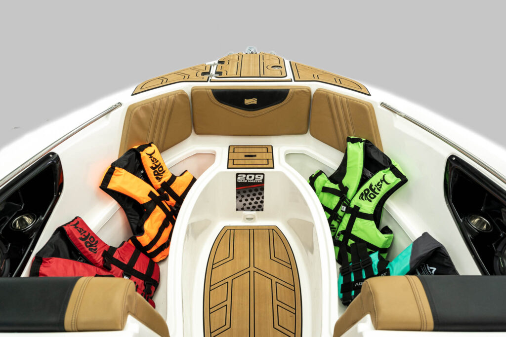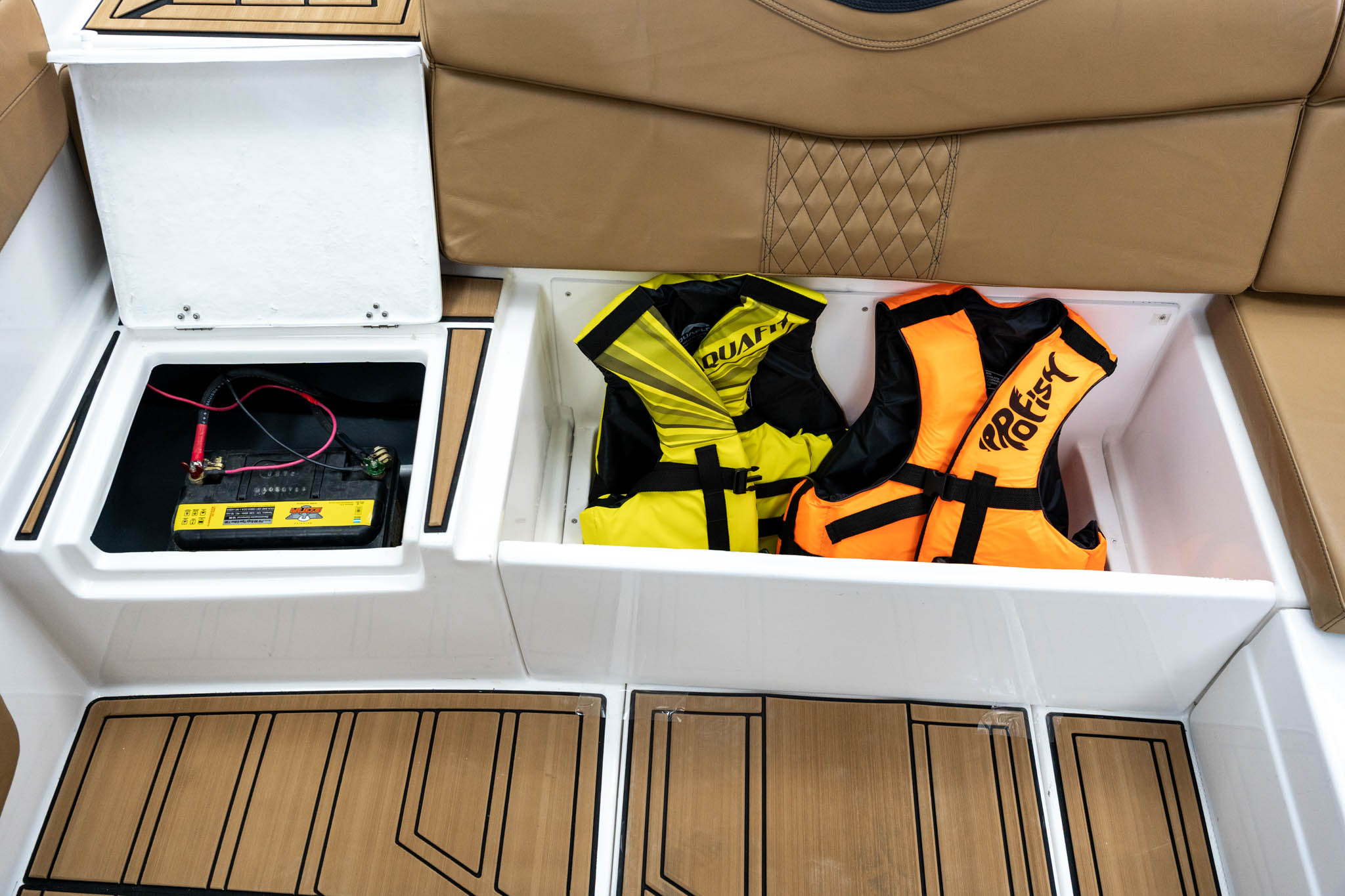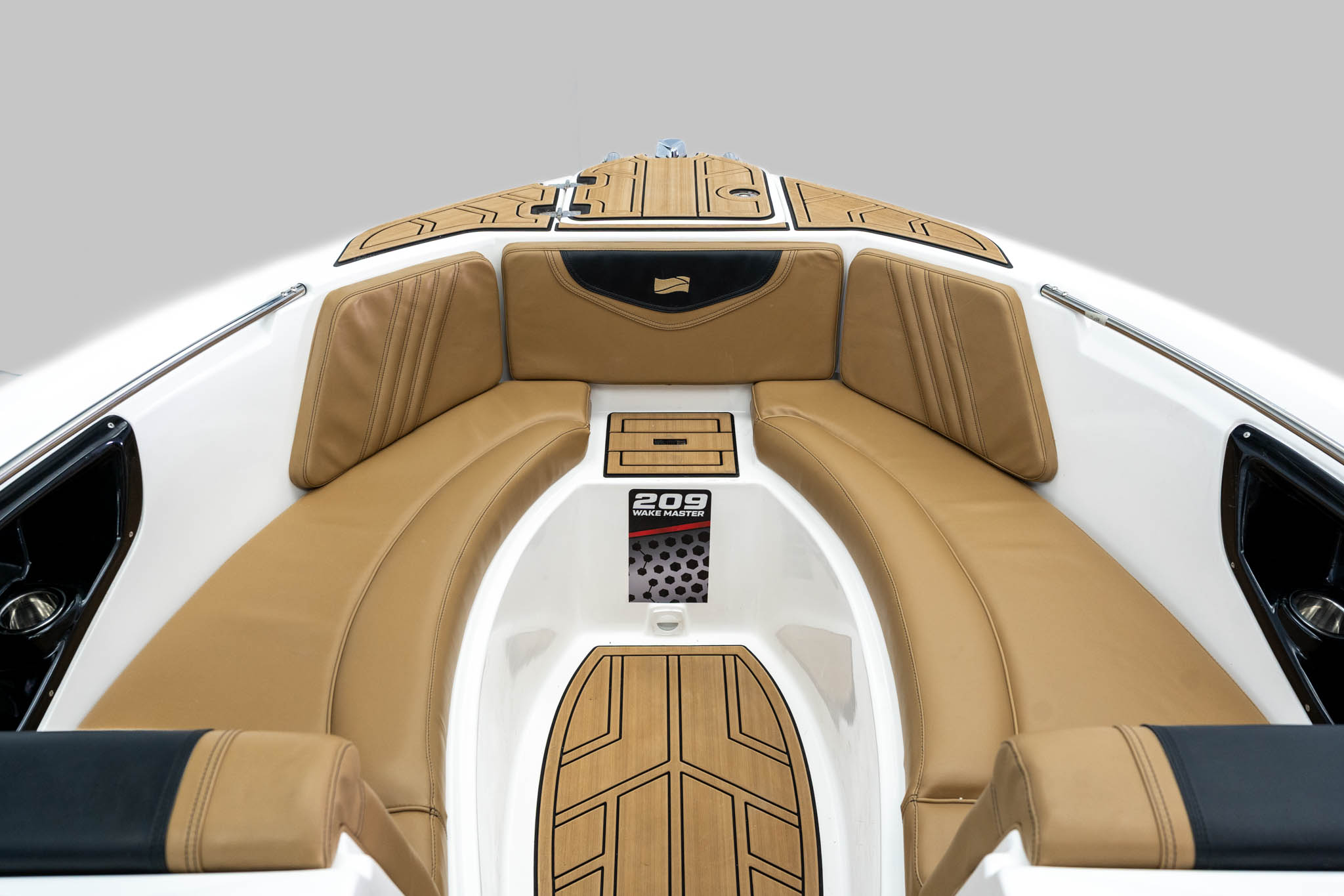 - Asientos tapizados en proa con almacenamiento moldeado debajo.