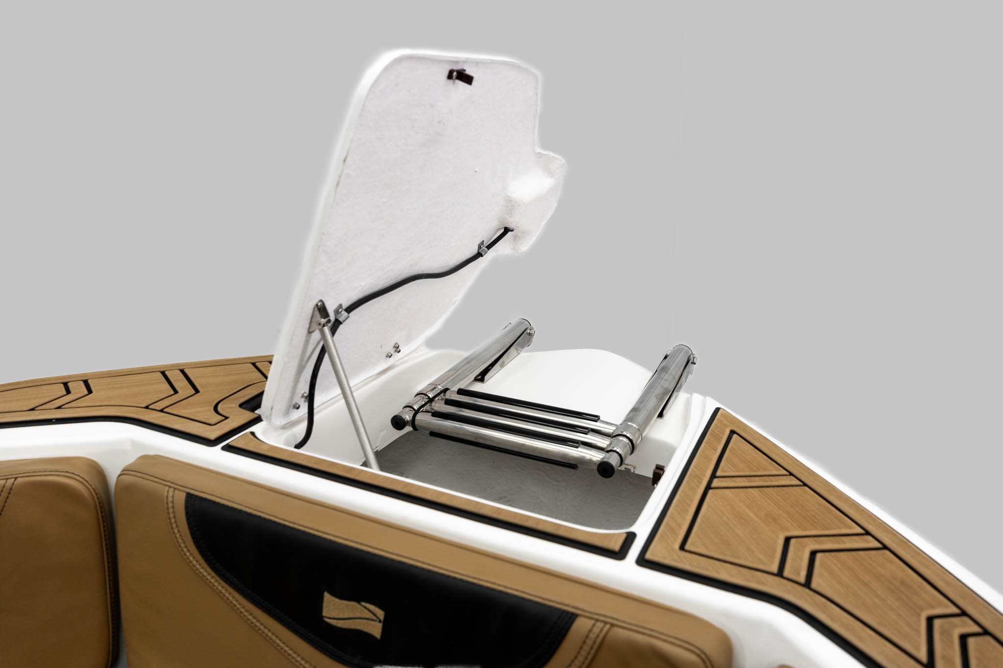 - Plataformas de baño de popa a babor y estribor con escalera de embarque plegable de 4 escalones montada en la parte superior y pasamanos integrado.