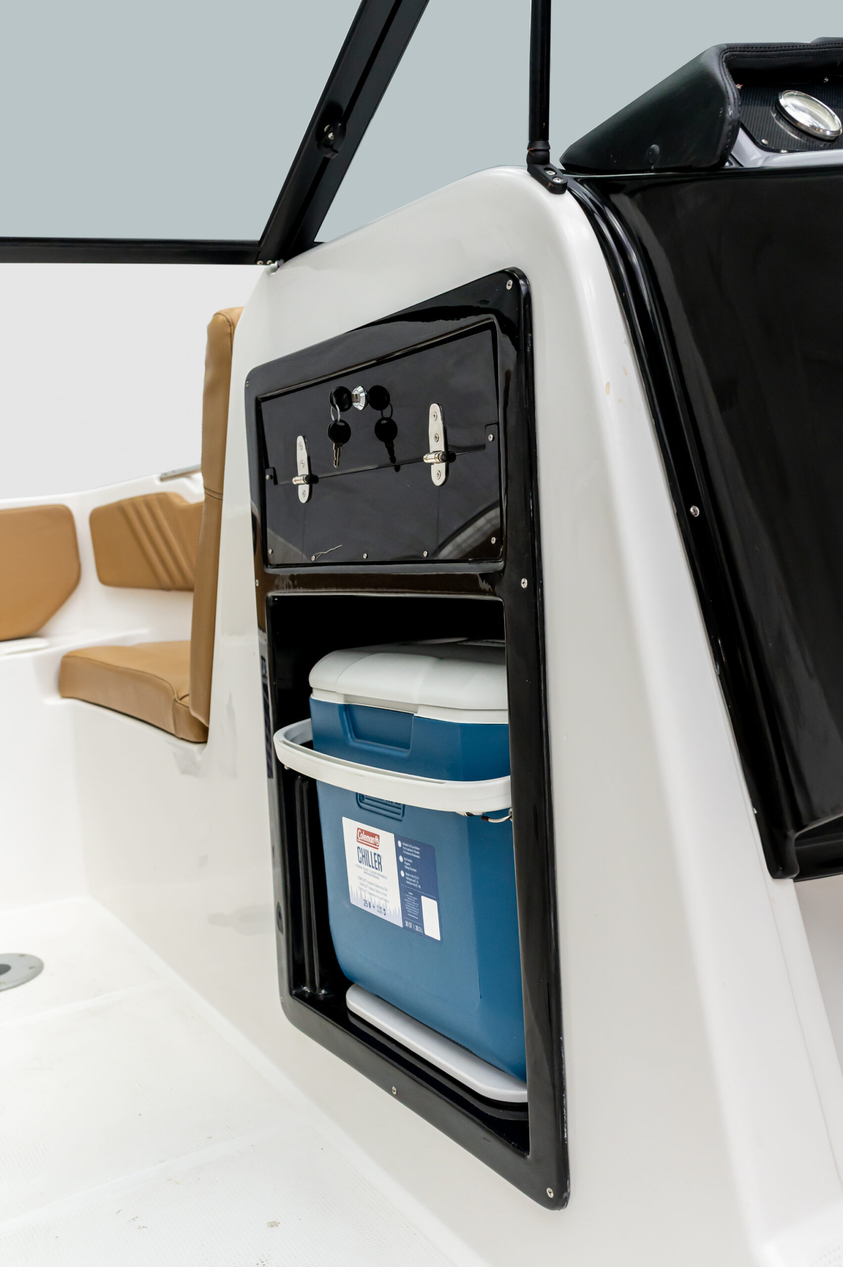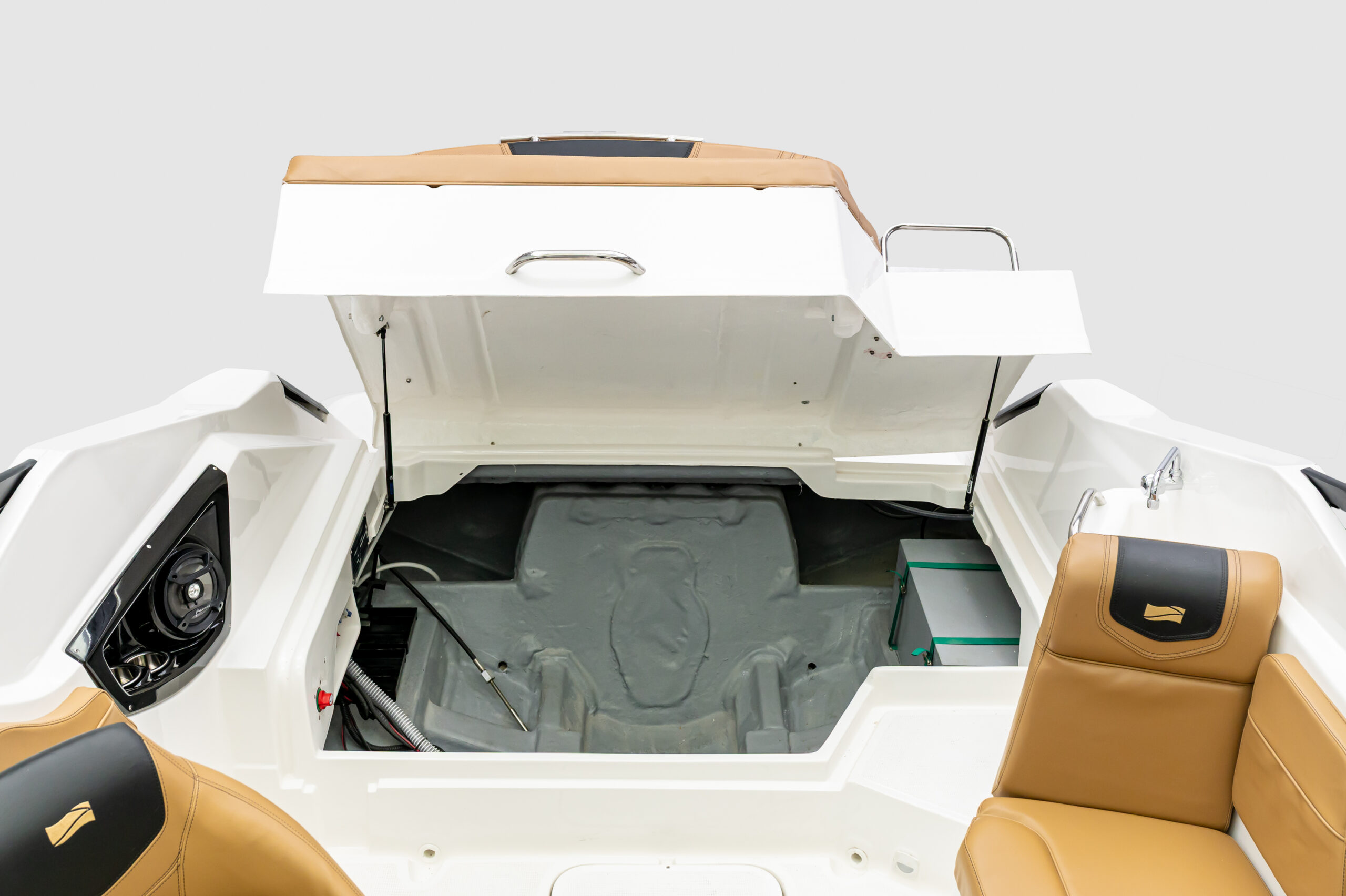- Asientos tapizados en proa con almacenamiento moldeado debajo.