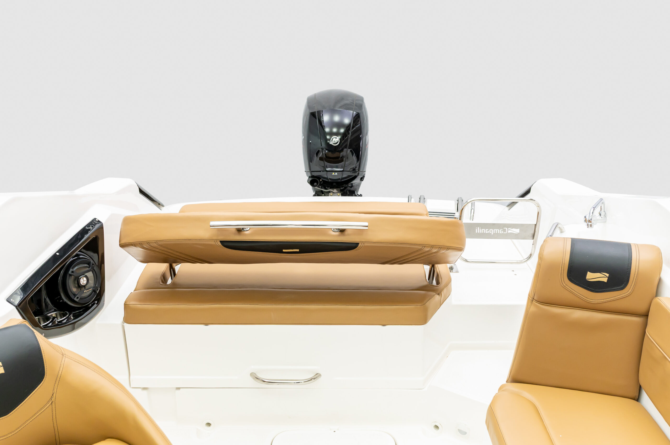 - Solárium de popa con respaldo basculante ajustable en dos posiciones (vista a proa/vista a popa) y compartimento inferior para motor dentro-fuera en la versión “DF” o baúl portaobjetos en la versión “OB”.